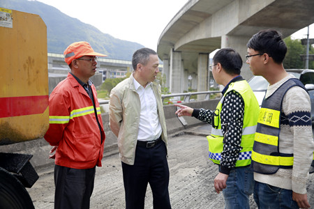 圖為集團副董事長、總經理張建平在攻堅養(yǎng)護施工現(xiàn)場檢查