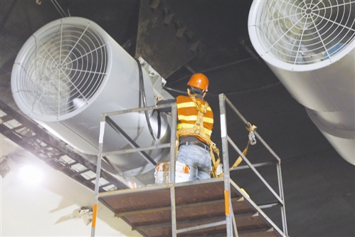11月1日是隧道整治施工的第四天,工地現(xiàn)場,多個作業(yè)面同時鋪開,施工人員三五個一組共近60來人,有序分工,緊鑼密鼓地開展各項作業(yè)。施工現(xiàn)場,有的站在活動腳手架上安裝燈具,有的在布管線、接線調(diào)試,有的在安裝風機……一項工序銜接著另一項工序,各個工種環(huán)環(huán)相扣。截止當晚10點30分,隧道內(nèi)燈具、風機全部安裝完畢,黃土嶺隧道群整治已完成總工程量的60%。