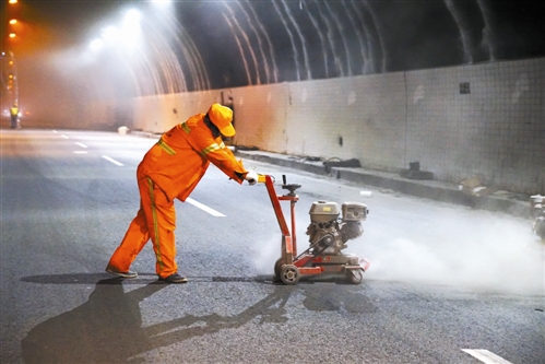 走進隧道,一股冷風侵襲,洞內(nèi)風大又潮。來自湖北的游師傅,負責噴隧道墻面乳膠漆。他有著20多年的豐富經(jīng)驗,在施工現(xiàn)場,他頭戴安全帽,身穿反光背心,緊系安全繩,一個人站在高高的架子上,底下4名工人不時緩緩地推動登高架。游師傅全然不顧洞內(nèi)的濕冷,大手一揮,熟練而均勻地噴灑著油漆,沒多久墻面便嶄新一片。