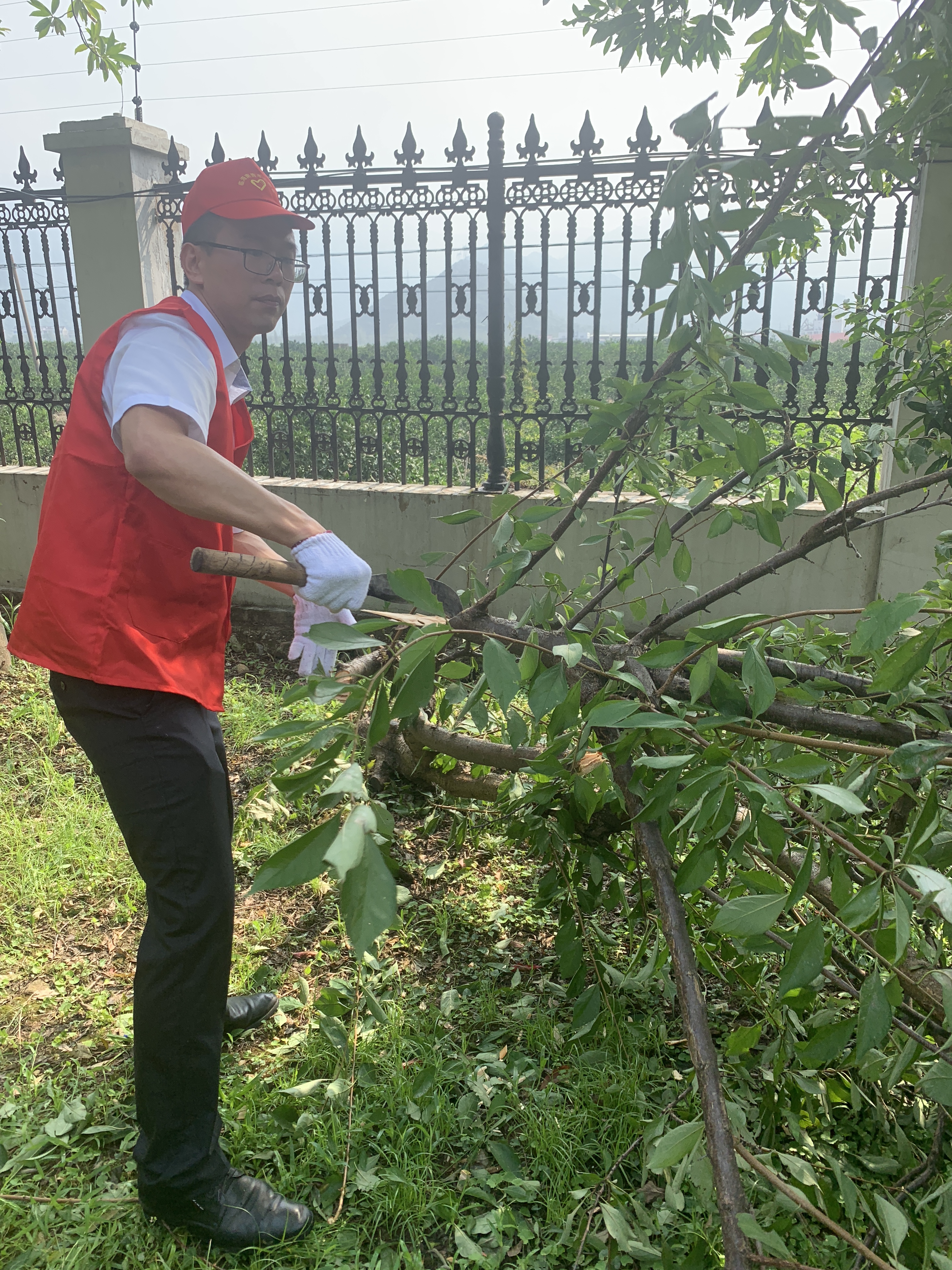 圖為志愿者合影 8月13日上午,該所志愿服務(wù)隊身穿統(tǒng)一紅色馬甲,積極投身到災(zāi)后恢復(fù)工作中。 “把砍刀給我,我力氣大,讓我來?!?/span> 活動過程中,孫明偉、杜廣勝、楊堅等同志一行先查看了配電房周邊綠化帶,看到有樹木倒伏,壓在防護網(wǎng)上,存在較大安全隱患,他們二話不說立即手拿砍刀,對樹木進行切割處理,并由李學(xué)平、包德福等人安排拉車將斷木等清理干凈。
