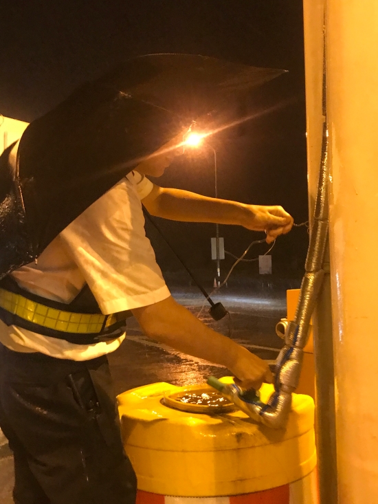 圖為收費員不顧狂風(fēng)暴雨捆綁水管