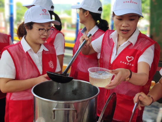 上午9點,志愿者們身著統(tǒng)一紅馬甲,在崗?fù)さ陌踩珝u上設(shè)立服務(wù)臺,抬出食堂提前制作好的青草糊、綠豆湯等清涼飲品。你來分杯我來送,大家不亦樂乎開始了送清涼活動。