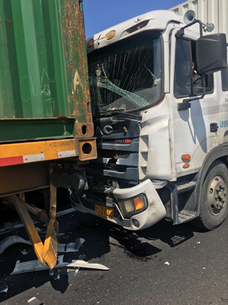 上圖為事故車輛 當(dāng)天中午,在副站崗?fù)づ哉镜墓ぷ魅藛T發(fā)現(xiàn)該所前方出口不遠(yuǎn)處有貨車停在那里不動(dòng),以致后面車輛無(wú)法通行。工作人員隨即跑到前方查看情況,原來(lái)是三輛貨車發(fā)生追尾,其中有一輛車車頭被撞得凹陷,擋風(fēng)玻璃也被撞碎,在了解事故現(xiàn)場(chǎng)無(wú)人員受傷后,工作人員馬上向監(jiān)控中心匯報(bào)情況。由于事故車輛較大面積滯留,導(dǎo)致后方車子堵到主線上,一些不明情況的駕駛員在車?yán)锸箘虐蠢却叽?,現(xiàn)場(chǎng)充滿焦躁情緒。 如何盡快疏通道路?正在食堂吃飯的一班班長(zhǎng)潘慶耀放下碗筷跑到事故現(xiàn)場(chǎng),同工作人員叫前面受損較少的事故車輛先把車子開出收費(fèi)站,再讓第三輛受損嚴(yán)重的車子試著發(fā)動(dòng)車子開出去,所幸三輛車子都能開離車道。在將地上的破損碎片清理到車道兩旁后,工作人員繼續(xù)指揮車輛向前行駛,收費(fèi)內(nèi)廣場(chǎng)在較短時(shí)間內(nèi)恢復(fù)了正常通行。 沈芬芳