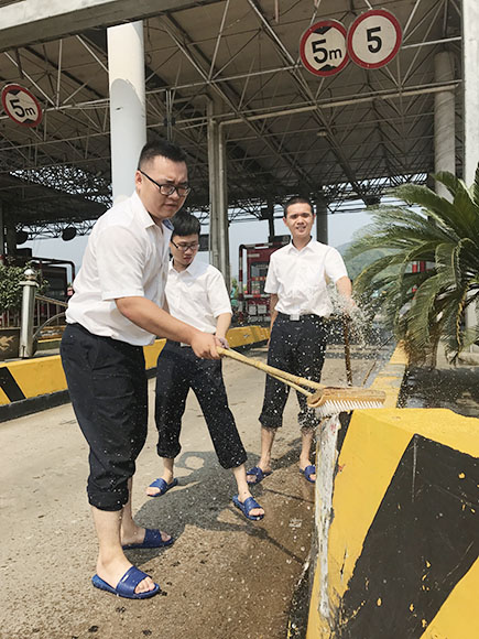 全體人員帶上掃把、抹布、水桶等工具,分成兩小隊,分別走向收費區(qū)域和辦公大樓。他們有的拿掃把清除車道上司乘人員順手扔下的果皮紙屑,有的用抹布擦亭外的設(shè)備設(shè)施,有的掃草叢中金黃色的落葉,做到不留衛(wèi)生死角、盲區(qū),讓炎熱的夏天出現(xiàn)了一道熱火朝天的勞動景象。盡管這段時間連續(xù)高溫,酷暑難耐,但在烈日下汗流浹背的他們,依然埋頭于個人的打掃工作。