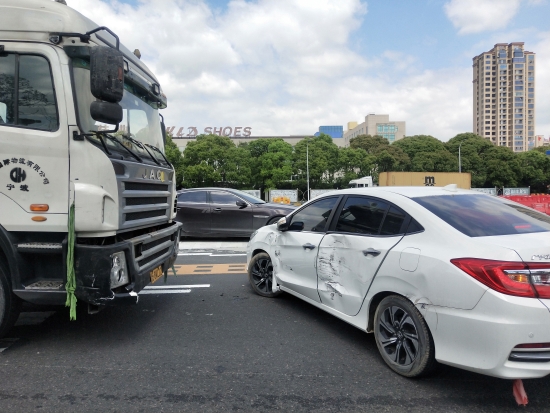 圖為事故現(xiàn)場 聽到巨響,收費(fèi)員立即上前查看,所幸兩車司機(jī)都安好,便立即開啟備用車道,以保證其他車輛通行順暢,并且在事故車輛后方放上小紅帽,告知后方來車及時(shí)駛?cè)肫渌嚨?。而兩車司機(jī)快速撥打交警電話,并且拍照留證,以最快的速度駛出收費(fèi)站靠邊等待交警處理。 經(jīng)調(diào)取錄像,查看事故緣由。“真相”竟是集裝箱司機(jī)引發(fā)的,該車從杭州寧波方向過來,小轎車司機(jī)從溫州方向匝道駛出,由于集裝箱司機(jī)下橋時(shí)沒有注意右方來車,只顧自己右拐車道,直接頂著轎車開出50多米,所幸未造成人員傷亡。 在此小編提醒大家:在駛?cè)朐训赖臅r(shí)候,司機(jī)要減速行駛;在選擇出口車道的時(shí)候,要仔細(xì)查看前后方和左右來車,且不要突然變更車道,否則容易造成車輛之間的親密“接觸”。 只有文明安全行駛,才是對自己和他人最好的保護(hù)。 鄭霞霞
