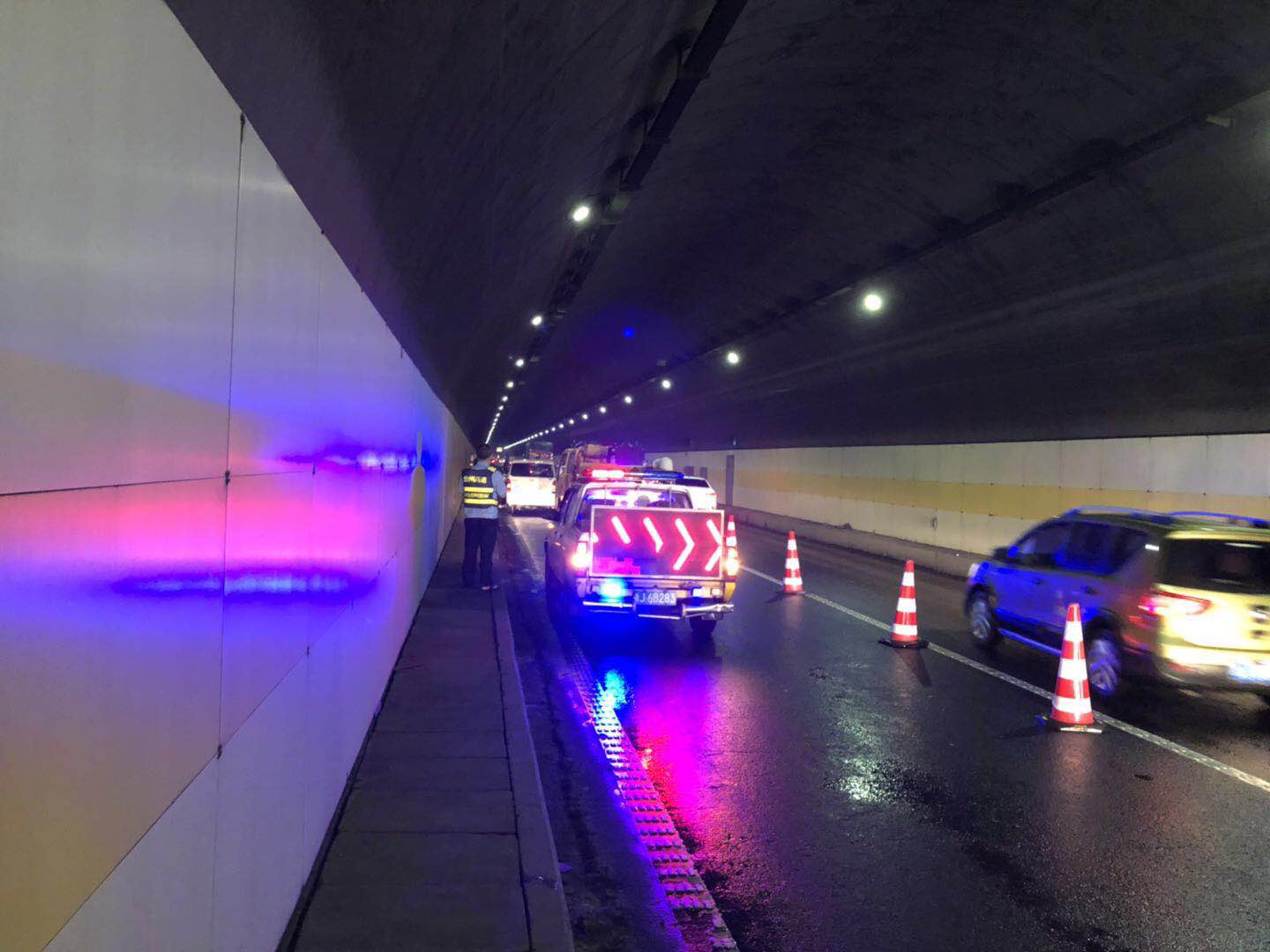 圖為事故現(xiàn)場預警 中控員利用錄像回放看到了驚人一幕:那輛白色面包車在黃土嶺寧向隧道K900米處,突然失控,撞上左側(cè)隧道壁,于是駕駛員慌亂中急打方向,又撞上右側(cè)隧道,現(xiàn)場情況猶如電影鏡頭,險像環(huán)生,當車子拋錨在洞內(nèi)時,因為執(zhí)勤隊及時出警,沒有發(fā)生二次事故,車輛受損情況也不嚴重。 在此提醒廣大駕駛員朋友,開車時候一定要集中注意力,不要分心,避免因操作不當造成不必要的損失,以免引發(fā)交通事故。 林玲