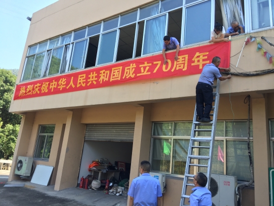 連日來,在所負責人的帶領下,工作人員分工明確、團結協(xié)作,安裝旗桿、彩旗、掛橫幅……整個布置工作有條不紊地進行。經過幾天“梳妝打扮”,管理所入口兩側綠化帶上插滿了靚麗鮮艷的各色彩旗,辦公樓門口懸掛了大紅燈籠,外墻上懸掛“熱烈慶祝中華人民共和國成立70周年”“歡度國慶”橫幅在嶄新的國旗、紅色橫幅、大紅燈籠等一系列喜慶紅色氛圍的襯托下,管理所處處洋溢著歡樂的節(jié)日氣氛,全體員工也滿懷喜悅的心情,為迎接祖國70周年華誕的到來全力做好各項工作。