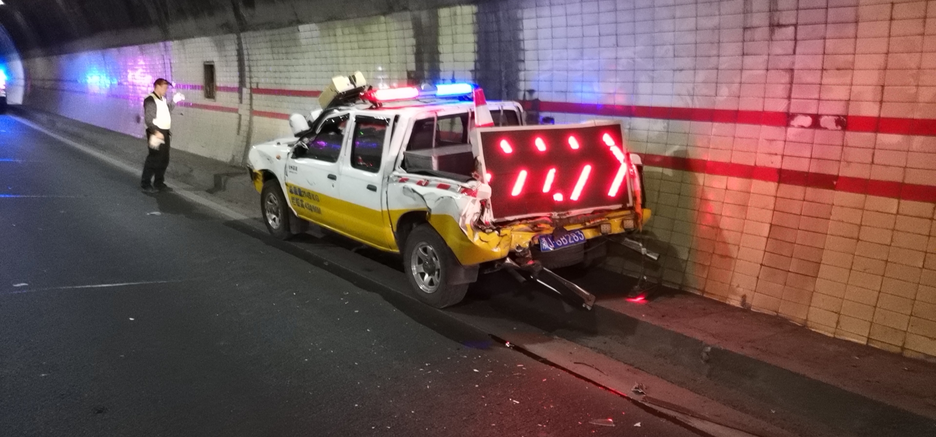 此次事故造成三車追尾,兩名執(zhí)勤隊(duì)員輕微受傷,雖然巡邏車損失慘重,但是因?yàn)?/span>執(zhí)勤隊(duì)員高度的工作責(zé)任心和對(duì)險(xiǎn)情的正確判斷處置,才未造成任何司乘人員傷亡,也未影響隧道正常通行。