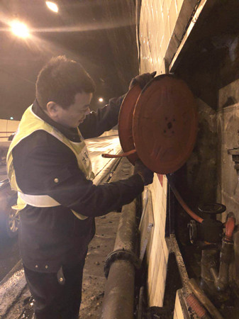 圖為檢查人員在檢查隧道內(nèi)消防箱