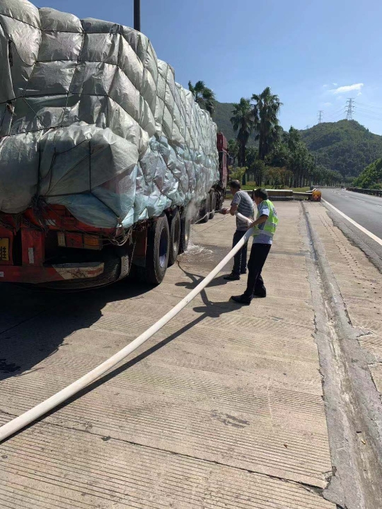 同時(shí),中控員密切關(guān)注車輛動(dòng)向,13:37,中控員在隧道南廣場發(fā)現(xiàn)該車,巡邏車立即奔赴現(xiàn)場,該車后輪胎剎車位置在冒煙,司機(jī)正用礦泉水澆輪胎,隊(duì)員們見狀,火速上前把消防栓打開,接上消防水帶,交與該車司機(jī),托著消防水帶,對(duì)準(zhǔn)輪胎接連猛射,冷卻剎車片,輪胎終于沒有冒煙,一場隱患被隊(duì)員消除了。