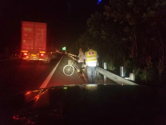 9242109,大溪嶺隧道所中控室發(fā)出通知。執(zhí)勤隊(duì)員接中控指令,迅速出警。晚上九點(diǎn),在高速公路上找人,需得打上12分的精神,巡邏車放慢車速,坐于后座的隊(duì)員們緊盯著車道兩旁,終于在2114分,距離寧向隧道出口一公里處發(fā)現(xiàn)該騎車男子,隊(duì)員們立即上前將其攔住。眼前的一幕令執(zhí)勤隊(duì)員嚇出一身冷汗,該男子左手殘疾,單手騎車,晚上視線模糊,且高速公路車多,速度快,司機(jī)很難發(fā)現(xiàn)有行人,如發(fā)現(xiàn)躥出來的行人而采取緊急制動(dòng),會(huì)造成多起追尾事故,現(xiàn)場情況非常危險(xiǎn)!隊(duì)員們合力將自行車抬上車。