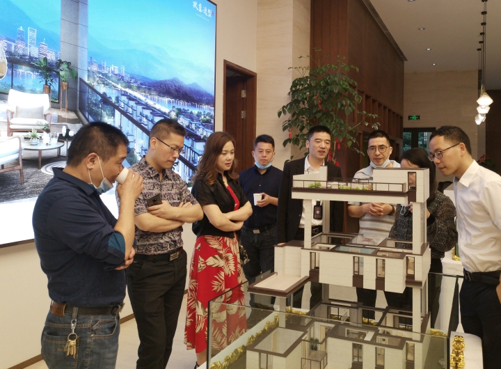 圖為陳文波對照圖紙了解樓盤情況 在銷售展廳樓盤沙盤前,陳文波聽取了高速房產(集團)公司負責人關于玖璽逸墅項目銷售計劃、認籌客戶等情況匯報。他對前期房產公司的辛苦付出給予充分肯定,要求大家認真服務好每一個來訪客戶,彰顯出國企品質,全力做好銷售工作。 當天,銷售展廳樓內,陸陸續(xù)續(xù)有客戶進出,“我很早就看中這個樓盤了,不僅位置好,而且采光好、通風好,居住在這里一定非常舒服?!币幻麥士蛻魪埮靠滟澋?,今天她特意前來交付認籌金。  圖為客戶在疊墅沙盤前參觀