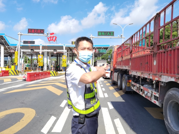 “師傅,慢點(diǎn),注意后方來(lái)車,往左一點(diǎn)?!睖貛X西收費(fèi)站入口處,一位身高一米七五左右的男同志正在維護(hù)著交通秩序。他就是征費(fèi)三班班長(zhǎng)李寧。酷暑高溫?zé)o法消磨他的斗志,揮汗如雨對(duì)他而言已是家常便飯。溫嶺西收費(fèi)站車流量大,貨車多,當(dāng)遇到三超車輛或者節(jié)假日的時(shí)候,入口處就會(huì)排成長(zhǎng)龍。七八月份的太陽(yáng)十分毒辣,經(jīng)過一天的高溫,收費(fèi)站入口的馬路上熱浪滾滾,人站在外面不到5分鐘就會(huì)汗流浹背。但為保持入口交通的安全暢通,李寧不斷做著各種不同的手勢(shì),指揮著過往的車輛通行,絲毫顧不得擦拭順著臉頰流下來(lái)的汗水。他就是臺(tái)州高速上的最美堅(jiān)守者。