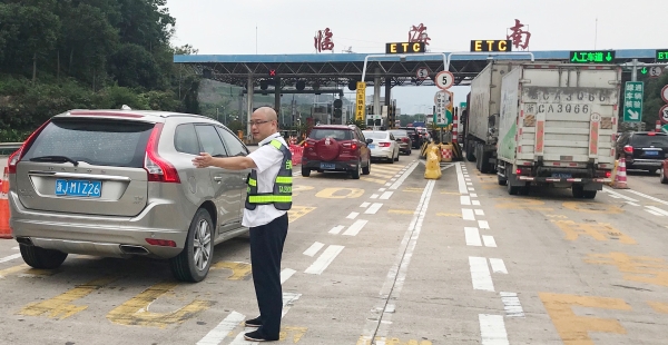 節(jié)日期間,車流量比往日多很多,每天多次出現(xiàn)長(zhǎng)時(shí)間大分流,一遇上高峰期車輛源源不斷地從各個(gè)方向匯聚在此,容易造成內(nèi)外廣場(chǎng)堵車。臨海南收費(fèi)所車輛雖多,但該站所出口秩序井然,未出現(xiàn)擁堵現(xiàn)象。瞧!這位在車流中,身著反光背心在這場(chǎng)大車流中,揮舞著雙臂指揮著交通,讓飛馳的車輛通過客貨分離,有效降低客貨車隨意串道,達(dá)到快速放行的四班班長(zhǎng)楊俊輝。