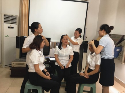 在老師的理論講解和親手示范下,在場人員分成兩組,現(xiàn)學(xué)現(xiàn)練,一組人用所學(xué)手法演示操作,另一組人坐著感受,老師在旁一一指點(diǎn)不足之處,然后兩組人員互換,交替學(xué)習(xí)。