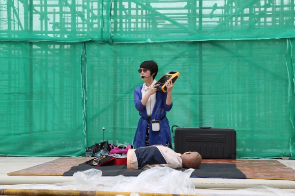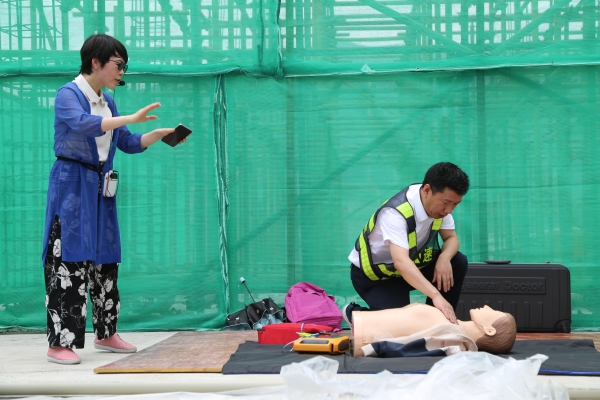此次演練的第二項重頭戲是心肺復(fù)蘇術(shù)培訓(xùn),建筑工地多為臨時工棚且露天作業(yè),受臺風(fēng)影響較大,心肺復(fù)蘇對于遭遇意外的施工人員來說如同救命稻草。高速集團安保部邀請了臺州職業(yè)技術(shù)學(xué)院副教授李美芬到演練現(xiàn)場進行心肺復(fù)蘇術(shù)培訓(xùn),李美芬詳細講解了心肺復(fù)蘇術(shù)和AED的理論知識、操作要領(lǐng)和具體方法,并規(guī)范熟練地進行了現(xiàn)場演示。隨后參與演練的各部門代表上臺學(xué)習(xí)實操,李美芬細心指導(dǎo)每一個動作,耐心講解每一個要點,教學(xué)效果顯著,有效提高了參演人員的急救技能。